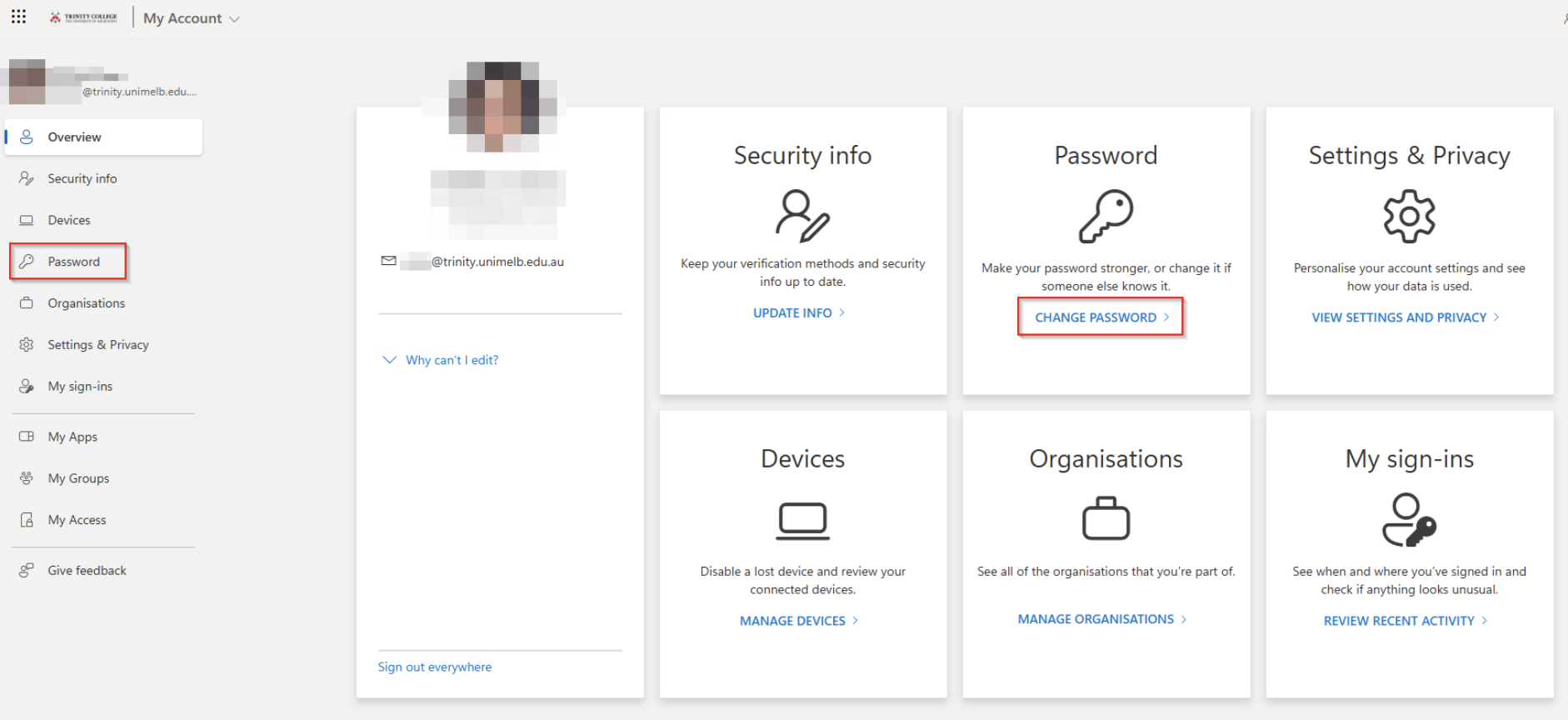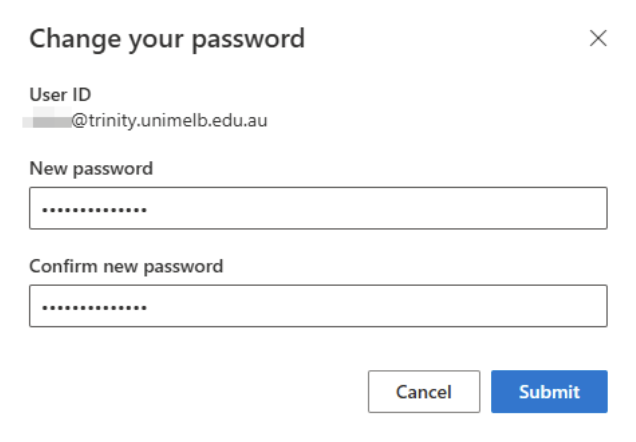 Your password has now been changed. Make sure to update it on any connected devices or apps (Outlook, Teams, Mail on your phone, Trinity Wireless connection, etc.).